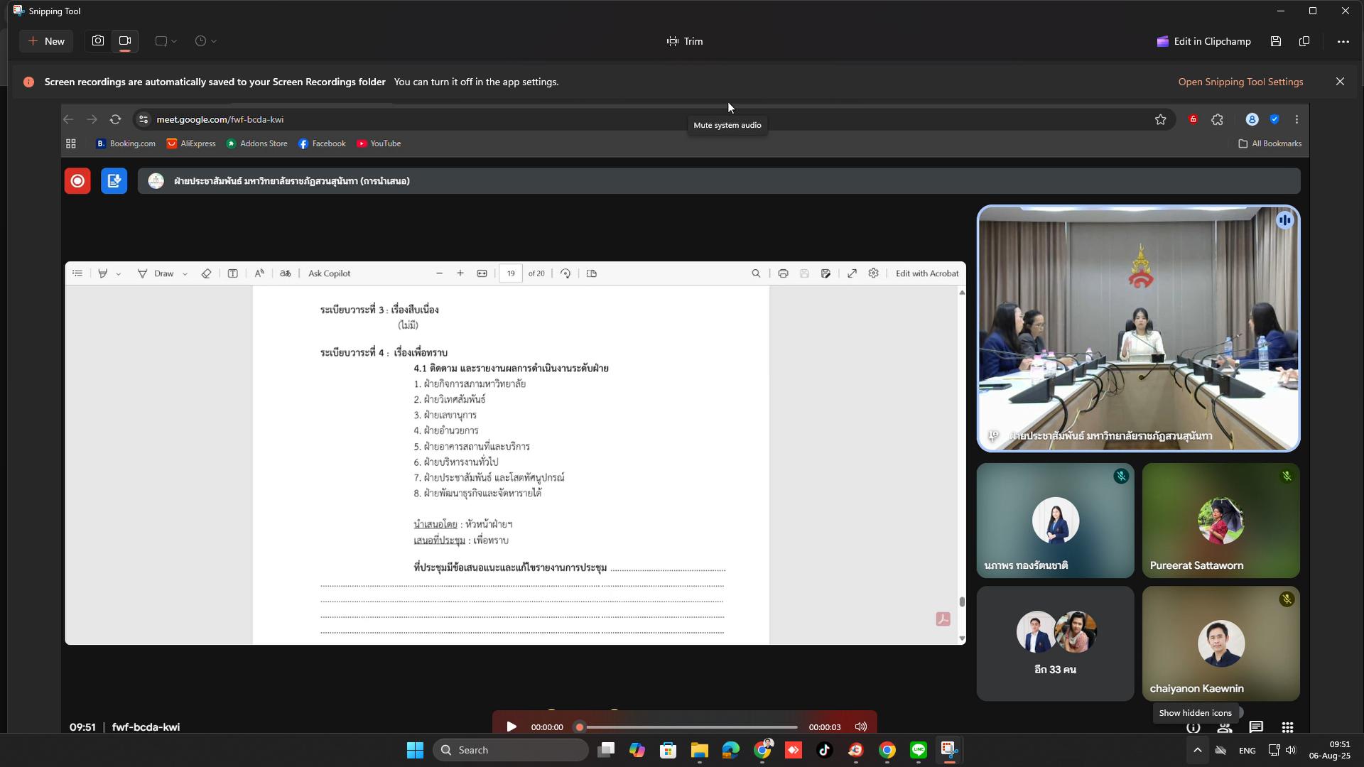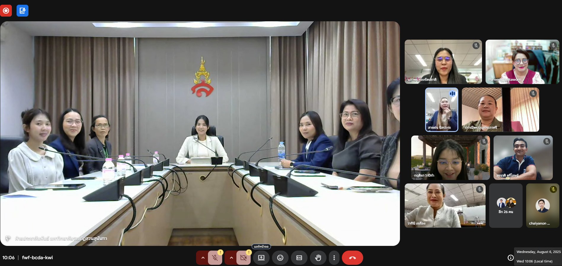วันที่ 6 สิงหาคม 2568 กองกลาง สำนักงานอธิการบดี จัดประชุมบุคลากรประจำเดือนสิงหาคม 2568 ณ ห้องประชุมปัญจมราช ชั้น 1 อาคาร 32 พร้อมถ่ายทอดสดในรูปแบบออนไลน์ผ่านระบบ Google Meet โดยมีนางสาววรางคณา คงศีล ผู้อำนวยการกองกลาง เป็นประธานการประชุม